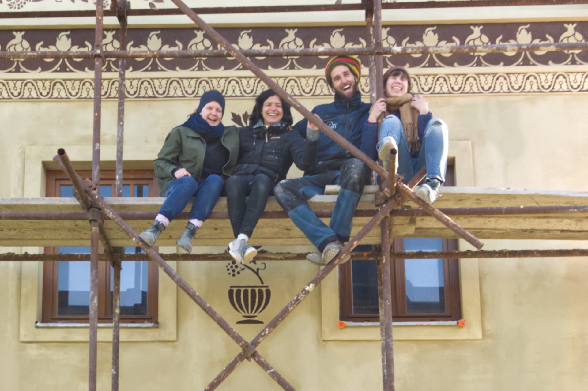 Jsme Samuel, Alex a Andrea, restaurátoři kamene a nástěnných maleb. V naší práci se denně setkáváme s úkoly, jako jsou tmelení chybějících míst, provádění nových omítek, ale také míchání správných tónů pro barevnou retuš. Naučili jsme se přistupovat k práci s pečlivostí, precizností a s úsměvem.